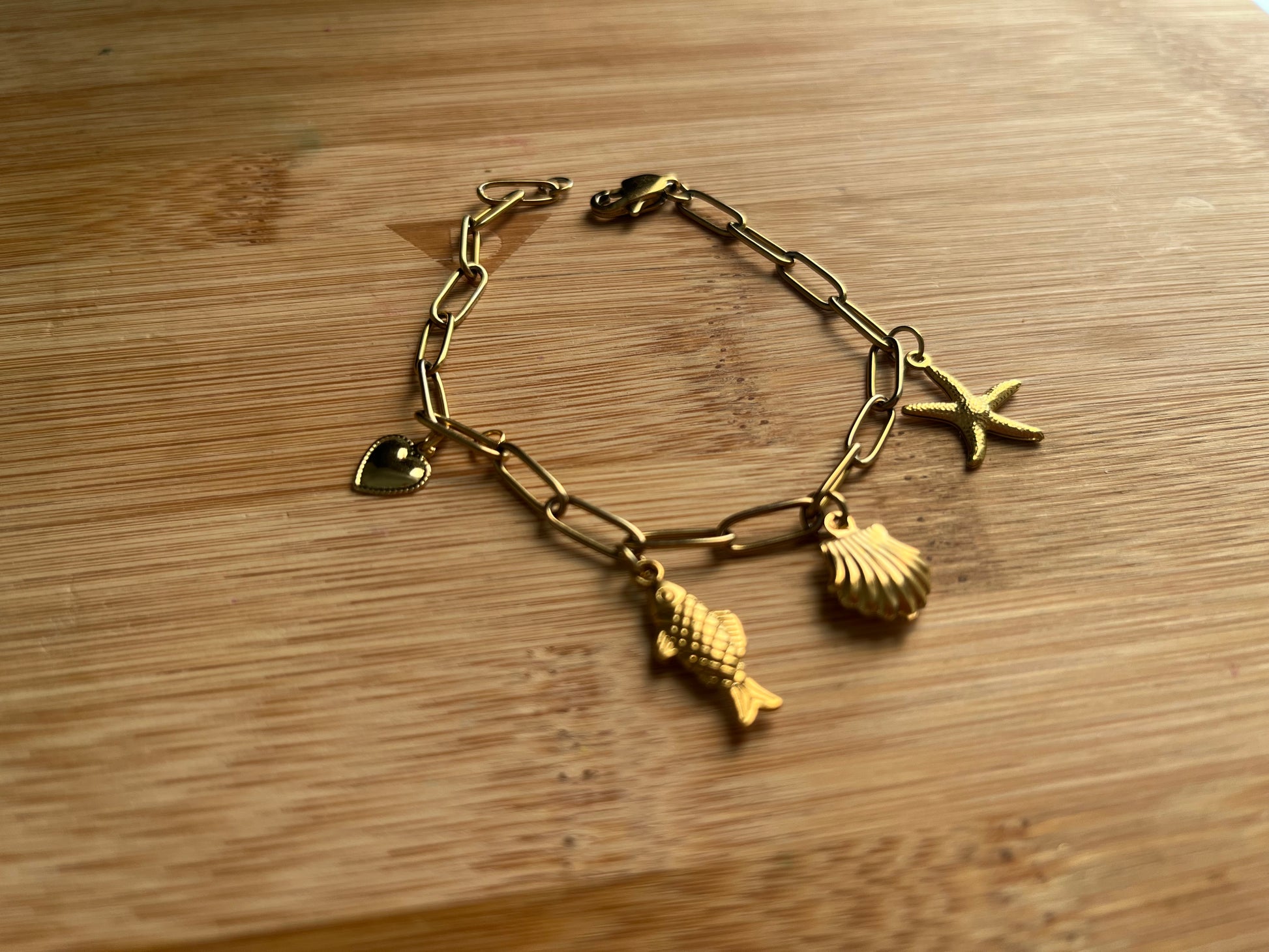 Bracelet en acier inoxydable, longues mailles, comprenant plusieurs charms/pendentifs sur le thème de la mer.